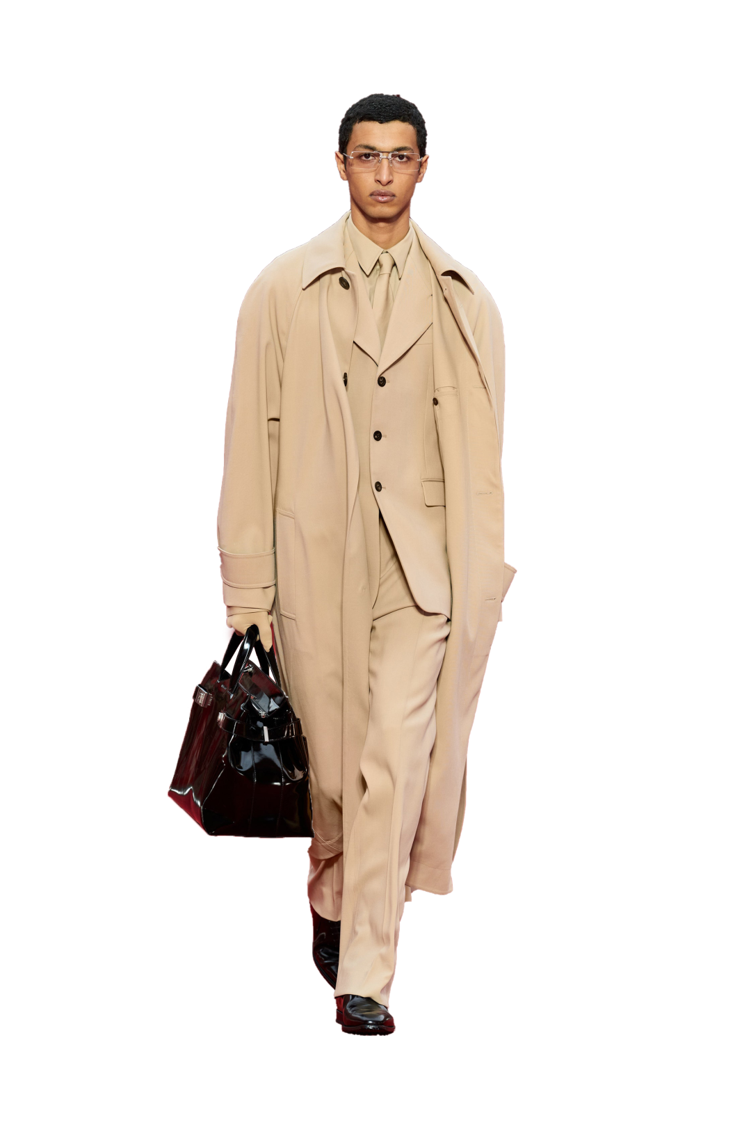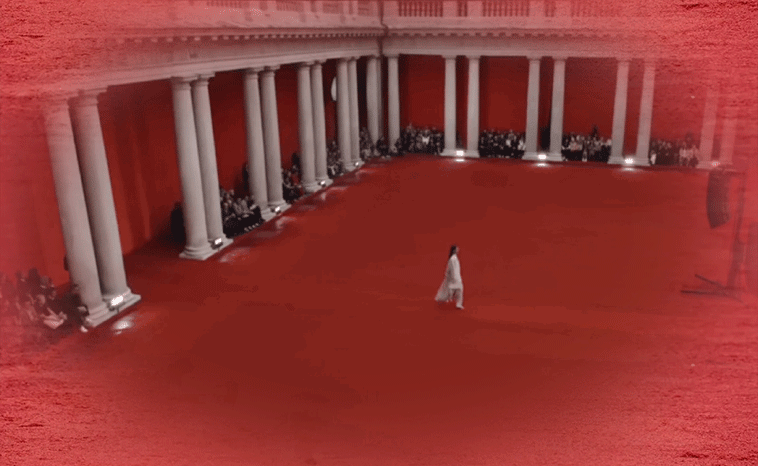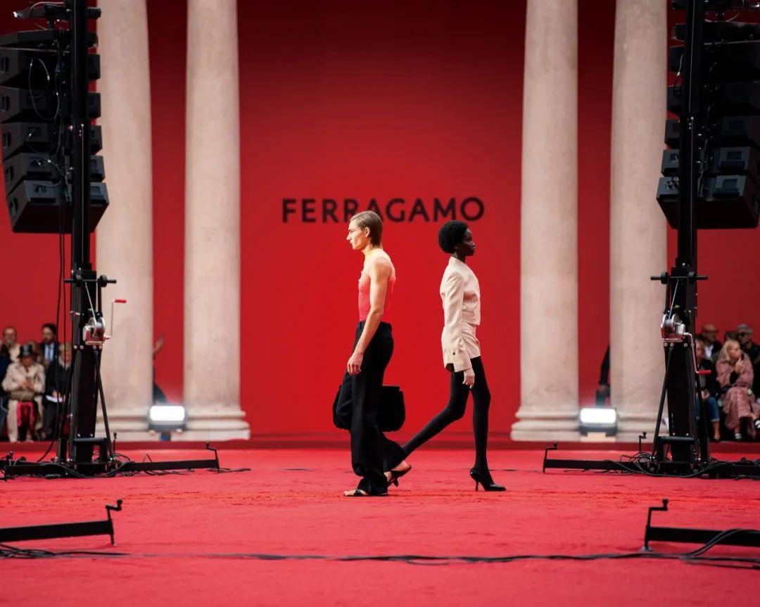 一場古典與當代、優雅傳統與先鋒視角的對話正在米蘭大主教管區歷史悠久的神學院舊址上演。秀場地面覆以紅色沙石,其配色靈感擷取自藝術家Rachel Harrison的“Sunset Series”(“落日”系列)作品。品牌全新旗艦色點亮了神學院建筑的神秘氣息,新舊交融之下,FERRAGAMO 與好萊塢的深厚淵源在現代視角下得以全新呈現。